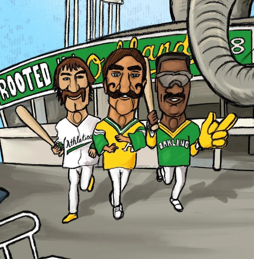 A satirical editorial illustration exploring local sports culture and the Oakland A’s relocation, utilizing vibrant colors and dynamic character movement to tell a complex community story.